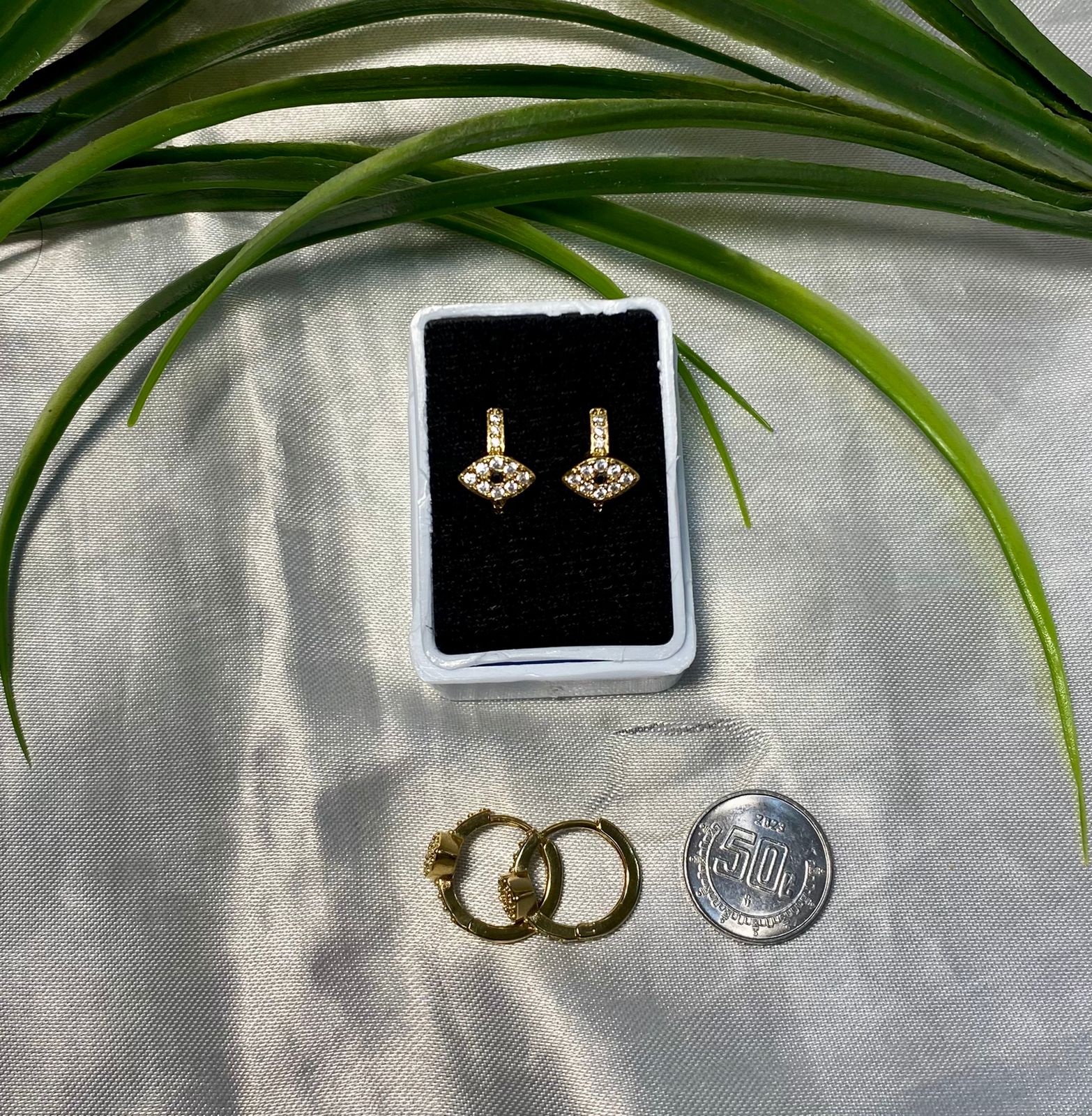 Arete tipo Huggies, ojo con Zirconia, Chapa de oro.