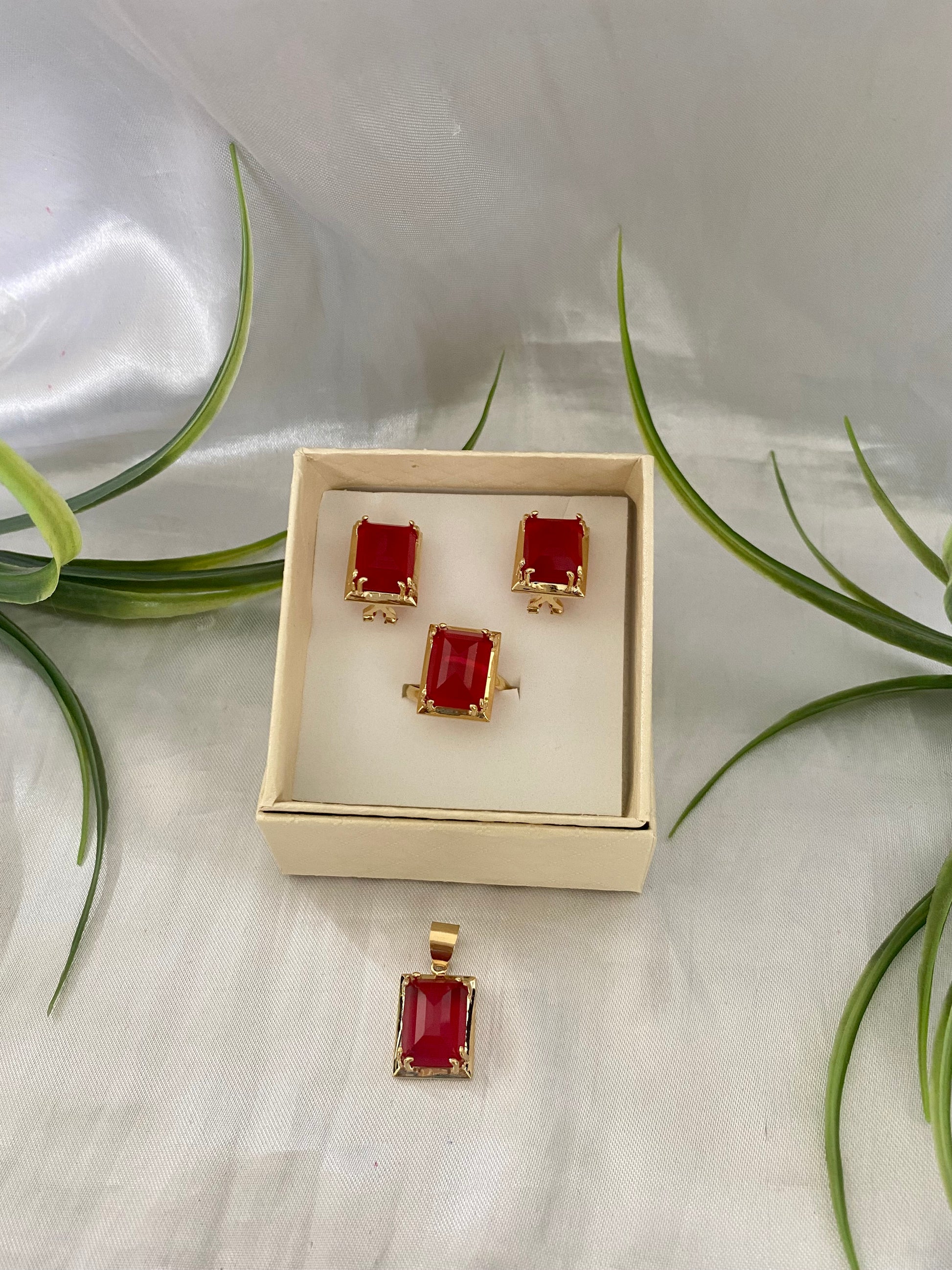 Juego de aretes, anillo y dije cuadro zirconia rojo