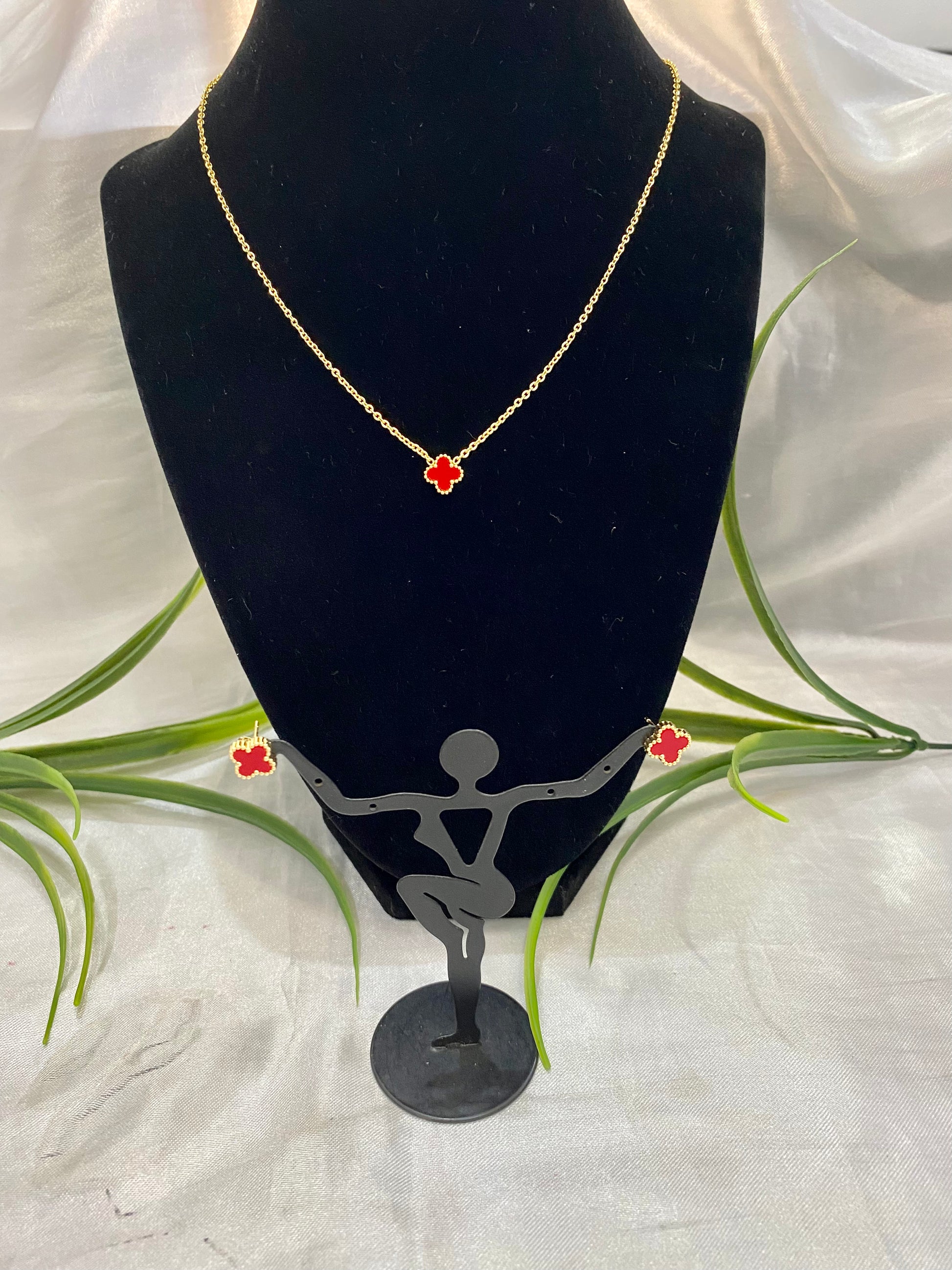 Juego de Collar y aretes de trébol rojo mini