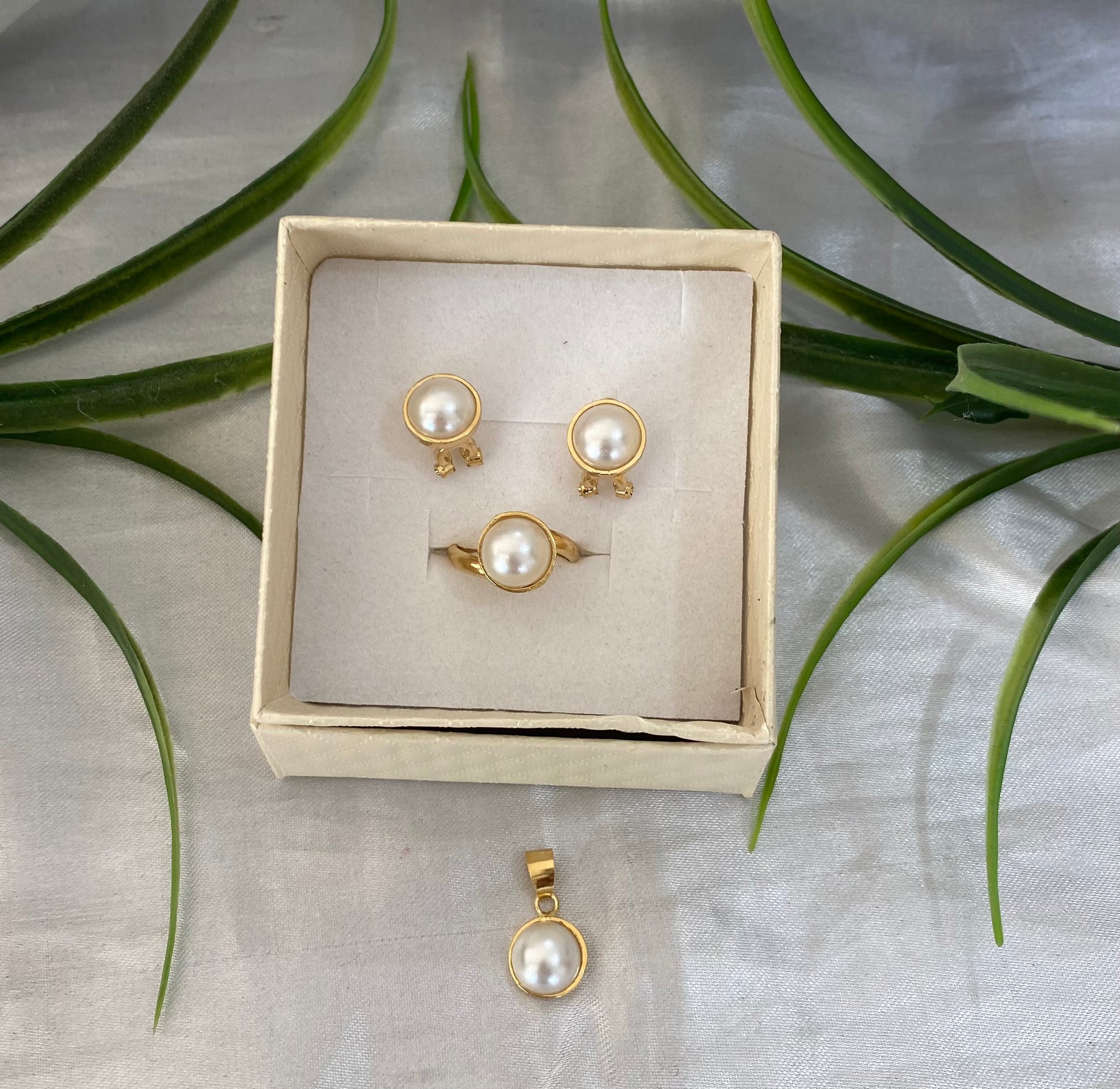 Juego de aretes,anillo y dije de Perla #10mm con bisel