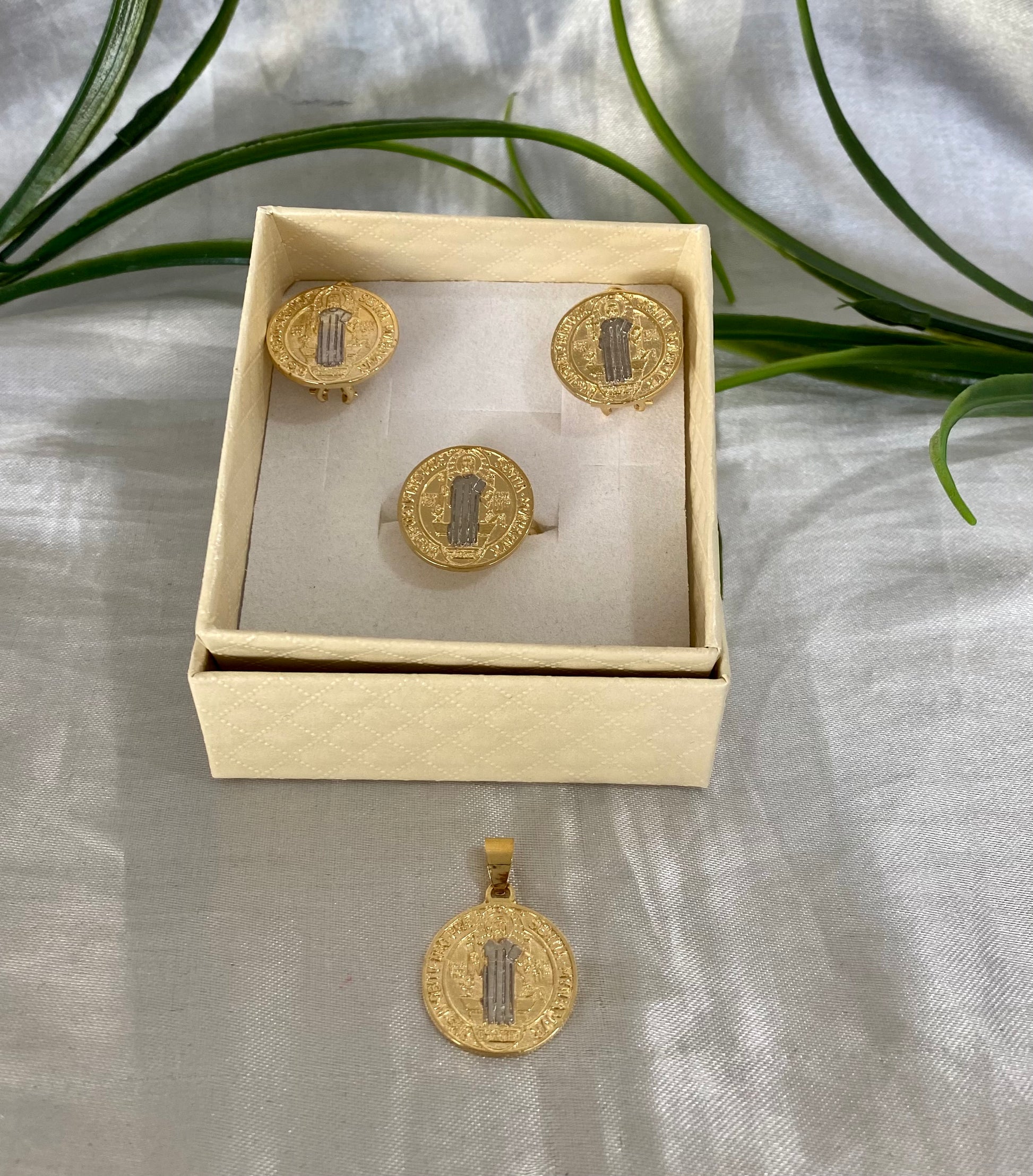 Juego de aretes,anillo y dije de San Benito bicolor